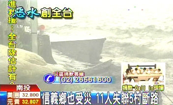 中國臺灣網8月10日消息 據臺灣TVBS電視臺報道,臺風重創南臺灣,但中臺灣的南投信義山區災情也不少,東埔村一處養鱒場目前還有11個人失聯,另外神木村也有15戶民宅,被泥石流淹沒,300個人緊急疏散;包括羅娜、新鄉和同富等5個村落,對外交通完全中斷,急需相關單位盡快搶信道路。