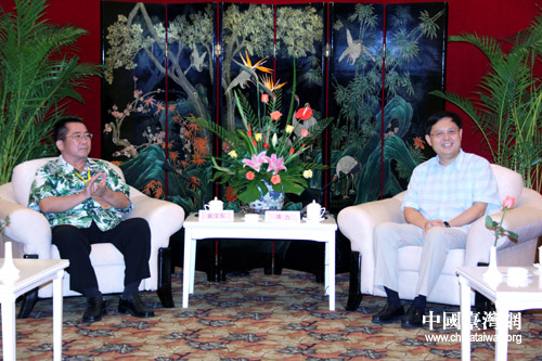 第二屆“兩岸媒體海南行”10日在海口正式啟動,中共海南省委常委、宣傳部長譚力(右)在10日晚間會見了由臺南縣記者協會理事長賴冠璋率領的臺南媒體一行(中國臺灣網 李徽 攝)