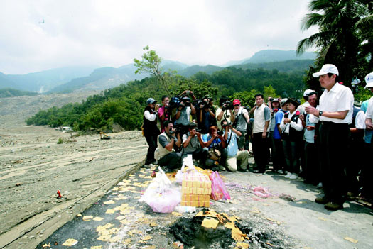 馬英九與高雄縣長楊秋興等官員捻香向罹難者致祭,望著全遭土石掩埋的小林村,肅殺場景讓馬英九神情極為凝重。