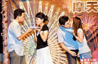 昨天七夕夜,臺北美麗華百樂園舉辦情人節闖關大考驗競賽,吸引不少情侶參加,游戲中女方須用嘴喂另一半棉花糖。