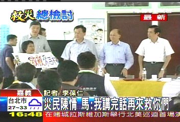 臺灣TVBS電視臺稱,馬英九站在第一線和災民親自溝通談遷村問題,面對民眾陳情用幽默化解。(羅煜明)