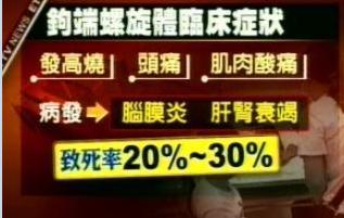 據臺灣“今日新聞”報道,萬丹鄉后灣村在8月17日爆發鉤端螺旋體病的疫情,之后附近的7個村鎮也陸續傳出疫情,據統計,萬丹鄉通報的疑似案例有180例,全鄉陸續有90多人住院治療,確定是鉤端螺旋體病的有51人,目前還在住院觀察的有20人,3人住在加護病房。