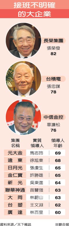 臺灣前30大企業(yè)中,有12家企業(yè)領(lǐng)導(dǎo)人超過60歲,其中3家超過70歲,例如臺積電張忠謀、中信金辜濂松、長榮集團張榮發(fā)等。
