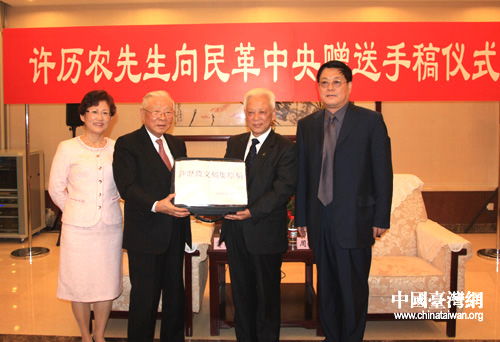 臺(tái)灣新同盟會(huì)會(huì)長許歷農(nóng)(左二)向民革中央主席周鐵農(nóng)贈(zèng)送手稿。(中國臺(tái)灣網(wǎng) 高斯斯 攝)