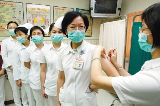 臺灣臨床醫護人員2日上午開始全面注射甲型流感疫苗,以防止疫情擴大。來源:臺灣《聯合報》