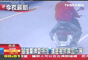 搶劫后妄圖腳遮車牌避禍的笨賊(來源:臺灣TVBS電視臺)