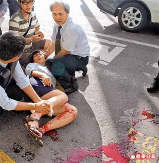 林美志為了護巨款,與搶匪拉扯時遭開槍擊中右小腿受傷倒地,血流不止,丈夫李德芳(右)不斷在旁安撫。 來源:臺灣《蘋果日報》