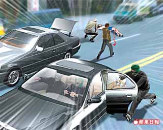 搶劫過程僅30鈔,三名搶匪帶著巨款,搭上一輛接應的黑色轎車逃逸。 來源:臺灣《蘋果日報》