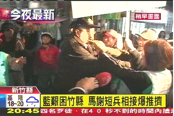 據臺灣TVBS電視臺報道,馬英九、謝長廷,各自帶著候選人掃街,沒想到半路上,狹路相逢,爆發沖突。綠營支持者不滿員警為了元首維安,在馬路上拿盾牌筑人墻,不讓拜票隊伍經過,情緒爆發。他們對著馬英九高喊:“為什么不能過去?為什么不能過?”混亂中還有人動手拉扯候選人旗幟,場面更加混亂。