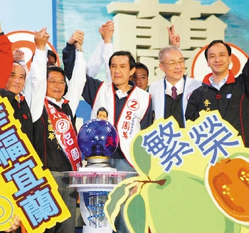 馬英九(中)、吳敦義(右二)、朱立倫(右一)、王金平(左一)等國民黨天王,昨晚齊聚宜蘭縣長呂國華(左二)幸福宜蘭之夜。(來源:臺灣《聯合報》)