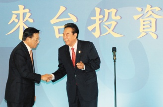 海協會和臺灣海基會昨天舉行陸資赴臺投資座談會,海基會董事長江丙坤(左)與海協會長陳云林(右)出席,向兩岸企業喊話招商。來源:臺灣《聯合報》