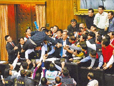中國(guó)臺(tái)灣網(wǎng)1月19日消息 據(jù)臺(tái)灣《蘋果日?qǐng)?bào)》報(bào)道,臺(tái)灣“立法院”昨日召開臨時(shí)會(huì)審查“地方制度規(guī)定修正草案”,國(guó)民黨強(qiáng)行表決三讀通過。在歷時(shí)70分鐘的表決過程中,藍(lán)綠大打出手,而藍(lán)軍憑借人數(shù)優(yōu)勢(shì),終于使提案完全按照國(guó)民黨版本過關(guān),臺(tái)灣“五都”(臺(tái)北市、臺(tái)北縣升格后的新北市、縣市合并后的大臺(tái)中市、大臺(tái)南市和大高雄市)鄉(xiāng)鎮(zhèn)市長(zhǎng)排除負(fù)面表列者,將可轉(zhuǎn)任區(qū)長(zhǎng),鄉(xiāng)鎮(zhèn)市民代表轉(zhuǎn)任無給職區(qū)政咨詢委員。