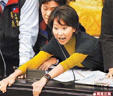 民進(jìn)黨“立委”陳亭妃一婦當(dāng)關(guān),萬夫莫敵,趴在主席臺(tái)上,不讓主席上臺(tái)開會(huì)。 來源:臺(tái)灣《蘋果日?qǐng)?bào)》