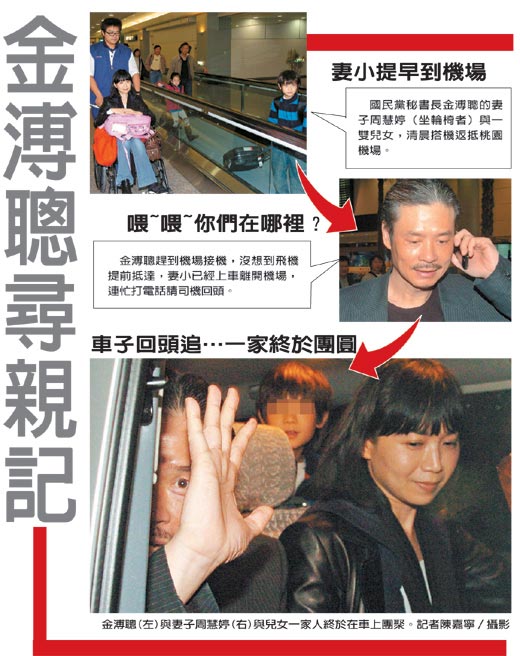 中國臺灣網1月20日消息 國民黨秘書長金溥聰的妻子周慧婷與兩個小孩今天飛抵臺灣,因腳傷未復原,周慧婷坐輪椅帶著小孩回臺。由于飛機早到,金溥聰接機撲空,上演一出“尋親記”,經緊急聯絡,一家人才順利團聚。(高大林)