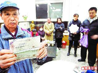 賣水果的老伯展示兩張沒用的支票。圖片來源:臺灣《蘋果日報》