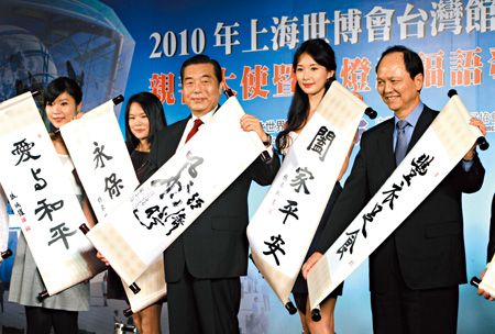 上海世博會臺灣館親善大使28日由臺灣館代言人藝人林志玲(右2)率領公開亮相,并與臺北世貿中心董事長王志剛(中)、副董事長吳文雅(右)出席。來源:臺灣《旺報》