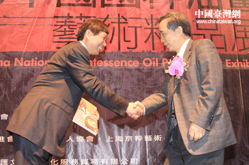 臺灣藝術大學校長黃光男(右)還代表臺灣各文化教育機構接受了承辦方上海京粹藝術品發展有限公司捐贈的2000冊《中國國粹油畫藝術精品兩岸三地展(畫冊)》。 (中國臺灣網 田云鵬 攝)