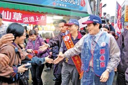 馬英九昨天下午陪同新竹縣“立委”補選候選人鄭永堂在湖口冒雨掃街,親切地和民眾握手。(圖:臺灣《中國時報》)