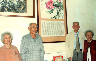 薛秋帆夫婦(右)與蔡騰芳夫婦(左)在薛秋帆贈送的牡丹畫前留影。
