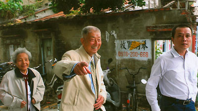 蔡騰芳的孫子蔡振德(右)帶領薛秋帆(中)夫婦觀看當年躲難的住處。