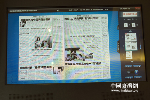國家圖書館為代表委員提供的電子報(bào)紙閱讀機(jī)安放在駐地賓館的走廊里,極大的方便了代表委員及時(shí)了解各方面的信息。(中國臺灣網(wǎng) 肖春陽 劉洋 攝)