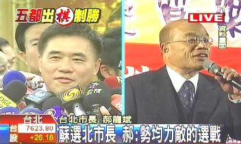 中國(guó)臺(tái)灣網(wǎng)3月3日消息 據(jù)臺(tái)灣TVBS電視臺(tái)報(bào)道,蘇貞昌將宣布參選臺(tái)北市長(zhǎng),而競(jìng)爭(zhēng)對(duì)手、爭(zhēng)取連任的郝龍斌,認(rèn)為雖然民調(diào)起起伏伏,但這是一場(chǎng)勢(shì)均力敵的選戰(zhàn)。