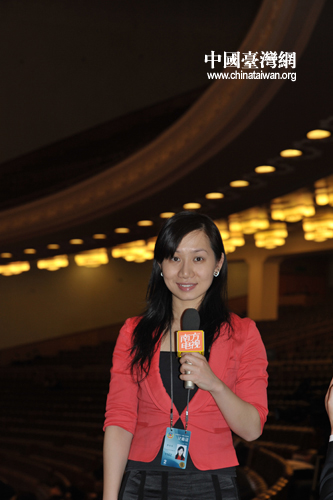 南方電視的美女記者在大會堂進行現場報道。 (中國臺灣網發 肖春陽、劉洋)
