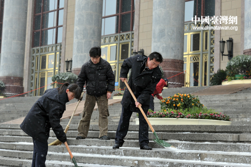 工作人員忙著清掃積雪。 (中國臺灣網發 肖春陽、劉洋攝)