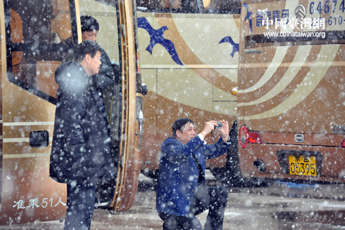 駕駛兩會(huì)保障車輛的司機(jī)師傅安全把代表委員送達(dá)后,忙里偷閑拍張雪中照。 (中國臺(tái)灣網(wǎng)發(fā) 肖春陽、劉洋攝)