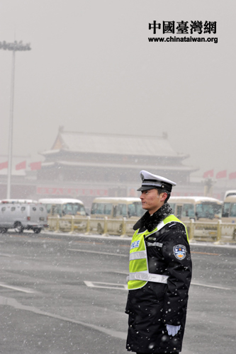 雖然大雪飛舞,但人民警察堅(jiān)守崗位屹然不動(dòng)。 (中國臺(tái)灣網(wǎng)發(fā) 肖春陽、劉洋攝)