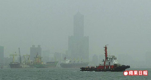沙塵暴襲臺,從高雄港海面上望去,原本可清楚看到輪廓的高雄市標志性建筑85大樓宛如海市蜃樓。 來源:臺灣《蘋果日報》