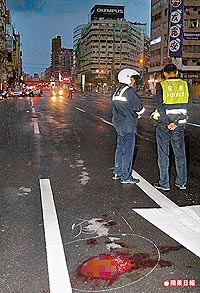 事故現場留下大灘血跡,但沒有監視器錄下經過與肇事逃逸車輛信息。圖片來源:臺灣《蘋果日報》