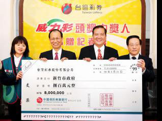 新竹市市長許明財(右二)、臺灣彩券公司董事長薛香川(左二)、臺灣彩券公司總經理黃志宜(右一)、臺灣信托慈善基金會副主任李婉如(左一)等人手持威力彩頭獎中獎人捐贈支票合影。圖片來源:臺灣“今日新聞網”