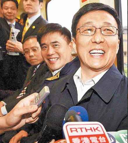 韓正(右)昨與郝龍斌(右2)首次搭臺北捷運體驗庶民文化,心情愉快。圖片來源:臺灣《蘋果日報》