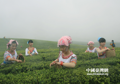 漫山遍野的茶樹翠色欲滴,美麗的采茶姑娘穿梭于茶樹之間,纖手拈芽,不亦樂乎。(中國臺灣網 李丹 攝)