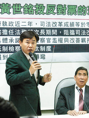 民進黨民代全數(shù)投下反對票,民進黨團干事長李俊毅(左)表示,希望讓黃世銘知道未獲得全面支持。 來源:臺灣《聯(lián)合晚報》