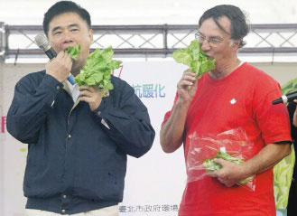 臺北市長郝龍斌(左)昨天參加蔬食抗暖化活動,現場生吃劉力學(右)所種的有機蔬菜。圖片來源:臺灣《聯合報》