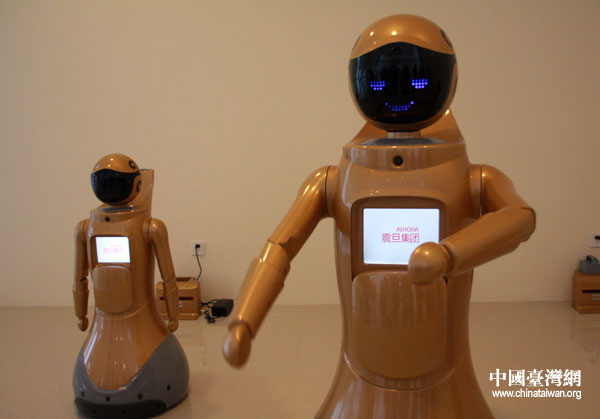 震旦館內還展出了三個機器人“震旦小子”,寓意震旦未來向高科技領域發展。(中國臺灣網 鐘寶華 攝)