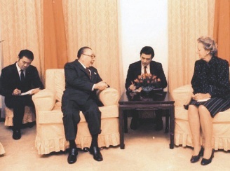 1986年,蔣經國接受《華盛頓郵報》葛蘭姆女士訪問,宣布即將解嚴。擔任翻譯的是英文秘書馬英九(右二),坐在蔣身后記錄的是葛光越。圖片來源:臺灣《聯合報》
