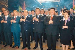 福建省長黃小晶(右三)與臺“立法院長”王金平(左三)、鎮瀾宮董事長顏清標(右二),向鎮瀾宮媽祖上香祝壽。圖片來源:臺灣《中國時報》