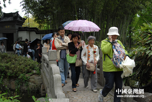 在南翔古猗園,臺胞母親們正在參觀樹齡470余年的盤槐古樹、唐代的經(jīng)幢、宋代的普同塔等景點(上海臺聯(lián) 王茜 攝)
