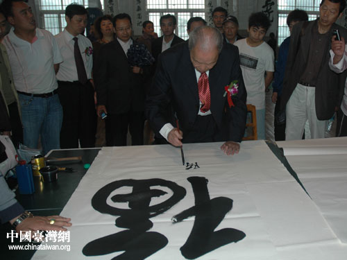 中國臺灣網5月13日九江消息 5月8日,九江學院體育訓練館內,一位九旬老人現場潑墨疾書,一幅幅遒勁有力的“!、“壽”等大字頃刻完成。這位動作矯健、思維清晰的老人,就是蜚聲海內外的臺灣著名學者、書法家、社會活動家,臺灣名人李敖和連戰的授業恩師——陳大絡。