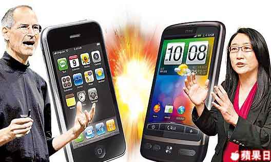 宏達電控蘋果侵犯五項專利。右為宏達電董事長王雪紅,左為蘋果執行長賈伯斯。圖片來源:臺灣《蘋果日報》