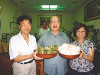 外埔鄉長劉陳吻(左)昨天贈送包子與粽子給臺中市長胡志強(中),讓胡市長非常高興。圖片來源:臺灣《聯合報》