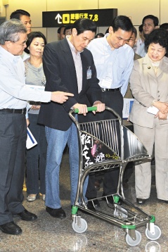 臺灣知名制作人王偉忠曾撰文批評桃園機場行李手推車,數量不足又缺乏保養。馬英九昨天特別到機場實際體驗新推車的質量。圖片來源:臺灣《聯合報》