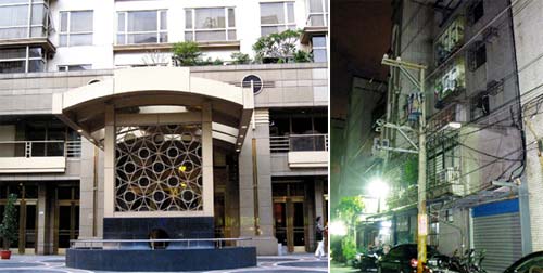 “富家男”溫建和住在臺(tái)北市的百達(dá)富麗豪宅(左圖),自稱身價(jià)數(shù)億元,他的會(huì)計(jì)女友梁玉姍月薪四萬元新臺(tái)幣,住在臺(tái)北縣三重市一棟舊公寓(右圖),卻侵占公款供他花用。圖片來源:臺(tái)灣《聯(lián)合報(bào)》