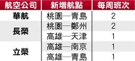 臺當局“民航局”昨公布島內航空公司新增航班分配結果,華航和長榮集團各取得15班,復興航空分得6班。新航線包括:華航的桃園飛青島、長榮的桃園飛鄭州和高雄飛天津,立榮的高雄飛南京和青島,新增航線每周共飛7班。
