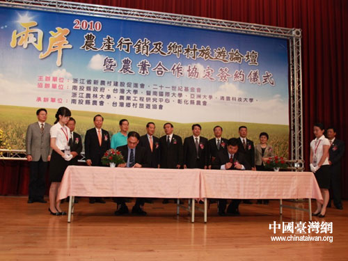 中國臺灣網6月13日南投消息 2010兩岸農產行銷及鄉村旅游論壇暨農業合作協議簽約儀式12日在南投舉行,浙江省長呂祖善和親民黨主席宋楚瑜出席。呂祖善表示,我們不僅要采購臺灣農產品,更要著力建立兩地農業合作的長效機制。當日,浙臺農業合作達成多項成果。