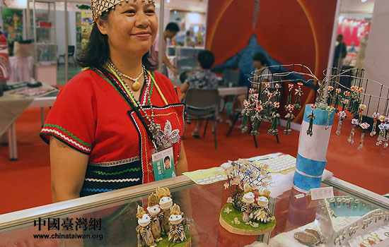 圖為第三屆海峽兩岸文博會臺灣文創展區內,臺灣少數民族手工藝者在展示作品。(中國臺灣網 張弛 攝)