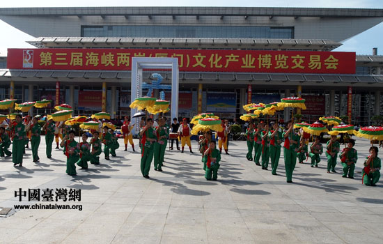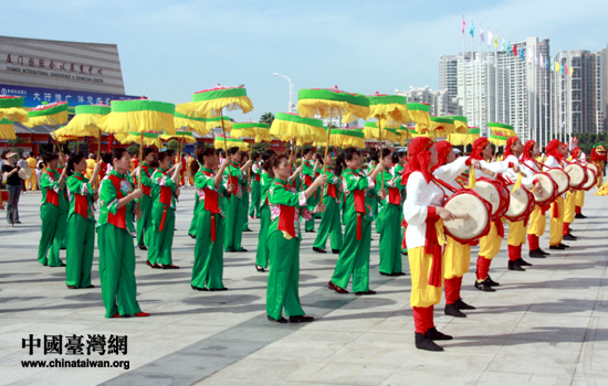 文藝團(tuán)體在會(huì)場前表演節(jié)目慶祝第三屆海峽兩岸文博會(huì)開幕。(中國臺(tái)灣網(wǎng) 高斯斯 攝)